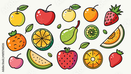 Vector art of a vibrant collection of cartoon fruits, featuring apples, oranges, strawberries, pears, watermelon, and more