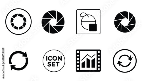 Vector art of collection of black and white icons representing various functions and settings, isolated on white background