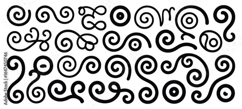 Vector art of collection of elegant swirl designs isolated on white background, featuring various patterns and shapes for decorative elements and graphic illustrations, perfect for adding a vintage