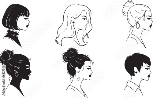 Vector art of collection of six diverse female profile illustrations showcasing various hairstyles and styles, isolated on a white background