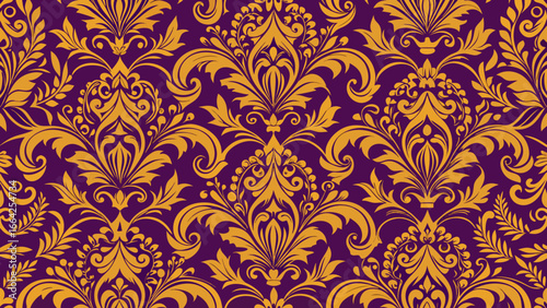 Vector art of golden damask pattern on a purple background creates a luxurious and elegant wallpaper design, perfect for adding a touch of vintage style to any project