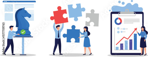 Vector art of illustrations depicting business strategy, puzzle solving, and data analysis for corporate growth and success