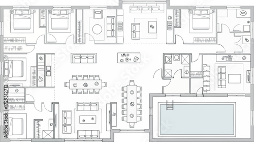 Vector art of modern house floor plan with open living spaces, bedrooms, and swimming pool