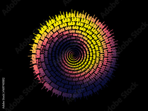Vector background of rotating ellipse 3D shapes, consisting of futuristic circle pattern and wavy lines with colorful gradations.