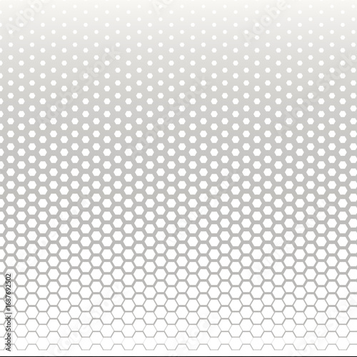 Vector background with a gray-white gradient formed by a repeating pattern of hexagons. The geometric structure creates an effect of depth, reminiscent of a honeycomb or technological ornament.