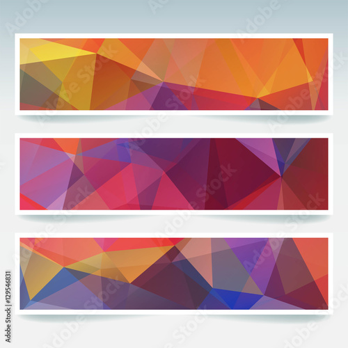 Vector banners set with orange, red, brown polygonal abstract triangles. Abstract polygonal low poly banners.