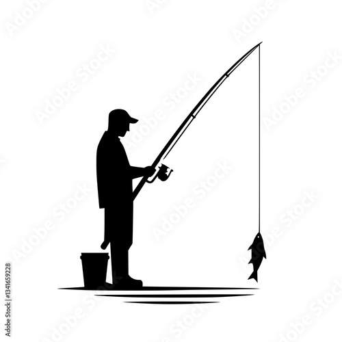 Vector black and white silhouette of a fisherman catching a fish, drawn with minimalist strokes