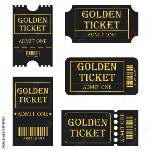 vector black ticket with gold text isolated on white background. Cinema, theater, concert, play, party, event, festival black and gold ticket template set.