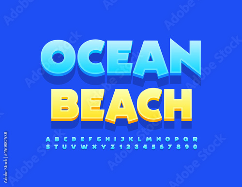 Vector bright banner Ocean Beach. Blue 3D Font. Playful Alphabet Letters and Numbers set