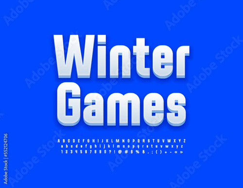 Vector bright emblem Winter Games. Elegant white Font. Modern 3D Alphabet Letters and Numbers.