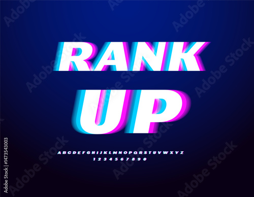 Vector Bright icon Rank Up. Digital Glitch style Font. Broken Uppercase Alphabet Letters and Numbers.