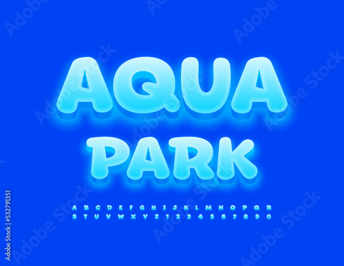 Vector bright template Aqua Park. Glowing blue Font. Creative Alphabet Letters and Numbers set
