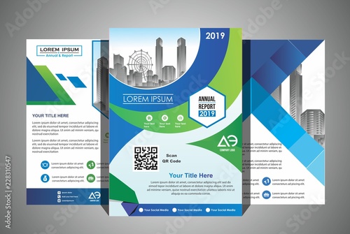 Vector Business brochure, flyers design template, company profile, magazine, poster, annual report, book & booklet cover, with green wavy line, and cityscape vector in background elements, size a4.