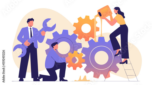 Vector Business Team Collaboration SVG Illustration with Gears in Flat Modern Style Bright Colors