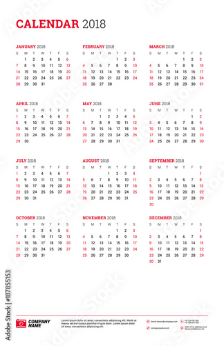 Vector calendar poster Tabloid size for 2018 Year. Week starts on Sunday. Stationery design template