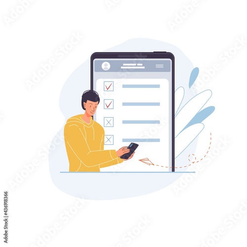 Vector cartoon flat character passing online survey,test,exam and checking results on screen mobile phone devices,monitors - distance online education and examination concept