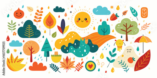Vector cartoon seamless pattern with autumn leaves, birds, and animals