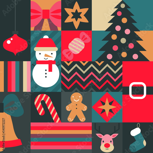 Vector Christmas seamless pattern assembled from squares with Christmas symbols and geometric ornaments. Vector holiday endless background of new year symbols
