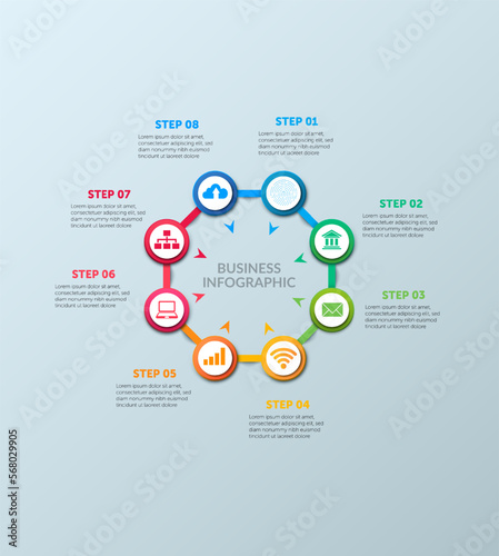 Vector circle infographic, cycle diagram, graph, presentation chart. Business infographics concept with 8 options, parts, and steps. Business Infographic processes. Creative concept for infographic