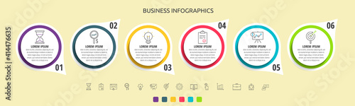 Vector circles infographic with 6 steps, labels. Timeline used for diagram, chart, web, banner, workflow layout, presentations, flowchart, info graph, content, levels, chart, processes diagram