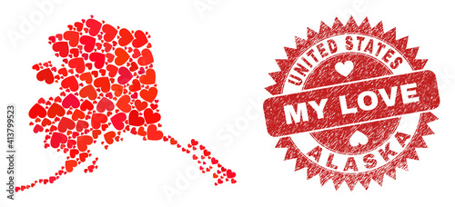 Vector collage Alaska map of valentine heart elements and grunge My Love seal. Collage geographic Alaska map designed with lovely hearts. Red rosette seal with unclean rubber texture and my love word.