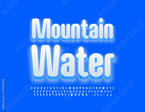 Vector concept emblem Mountain Water. White glowing Font. Set of modern style Alphabet Letters, Numbers and Symbols