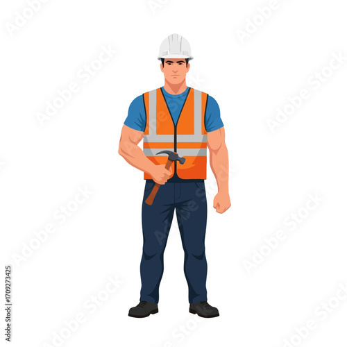 Vector Construction Worker Illustration | Builder with Safety Helmet and Hammer, Minimalist Flat Style, White Background