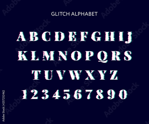 Vector distorted glitch font. Trendy style lettering typeface. Latin letters from A to Z