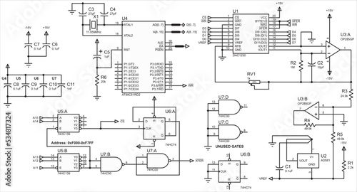 Vector electrical circuit. A complex large electrical circuit of an electronic device, operating under the control of a microcontroller.
