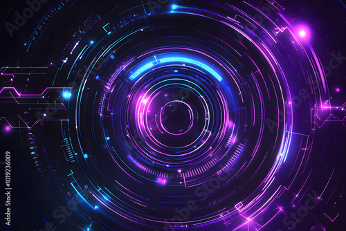 Vector futuristic background design with glowing purple and blue digital elements design, circles, and lines in the form of an illuminated energy field on a black background design