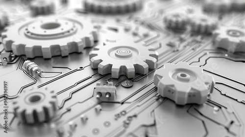Vector futuristic technology background, 3d white paper gear wheel on circuit board. Hi-tech, engineering, digital telecoms concept. Blank space for content, web template, business tech presentation