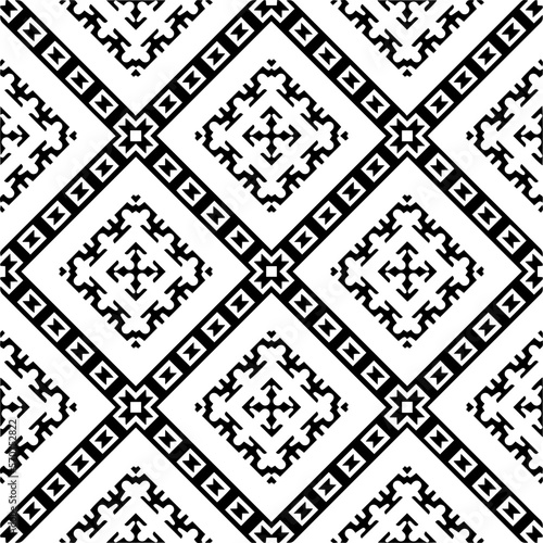 Vector geometric traditional folk ornament. Ethnic seamless pattern. Minimal ornamental background with abstract shapes. Black and white texture. Dark repeat design