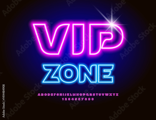 Vector Glowing banner Vip Zone. Modern Neon Font. Led Light Bright Alphabet Letters and Numbers set