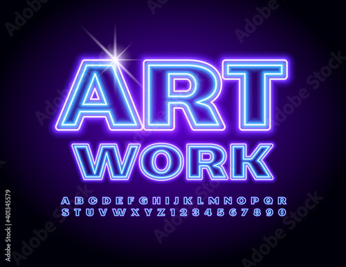 Vector glowing flyer Art Work. Modern electric Font. Bright Neon Alphabet Letters and Numbers set