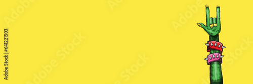 vector green cartoon Zombie rock n roll hand isolated on horizontal yellow background with space for text . vector Zombie party halloween background or horizontal heavy metal poster design template