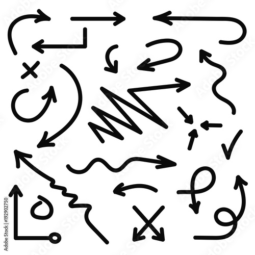 Vector hand drawn arrows set. Black sketch arrows in doodle style. Lines, circles, marks