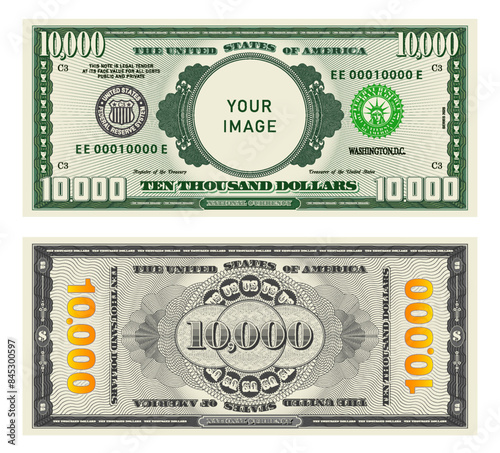 Vector highly detailed fictional beautiful 10000 US dollar banknote. Obverse and reverse of American bill with guilloche patterns. Empty circle in center. Sample, your image. Ten thousand dollars.