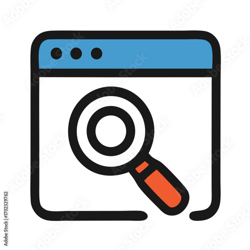 Vector icon of a web browser with magnifying glass, symbolizing SEO, search, website optimization, online research, and digital marketing. Perfect for apps, web, and business design