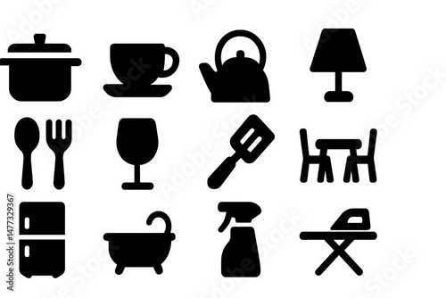 Vector icon set depicting various kitchen and home items including utensils, appliances, and furniture in a simple, cohesive design