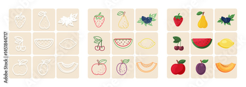 Vector icon set featuring various fruits like apple, cherry, plum, pear, strawberry and watermelon. Includes outline, colored and flat styles. Suitable for food branding, packaging and digital use