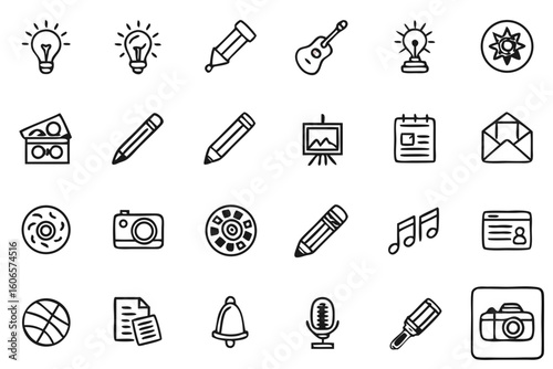 Vector icon set of 40 creativity and innovation concepts. Clean outline style, no boxes, grid-aligned. Perfect for design, branding, UX, and creative industries.