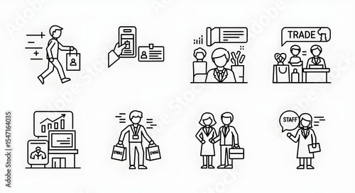 Vector Icon Set of Trade Show Visitors Interacting with Booths, Scanning Badges, and Carrying Swag Bags in Clean Outline Style