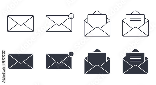 Vector icons letter mail. Check email, new message information. Email address, business correspondence and social media notification. Editable stroke thin line and black solid set.