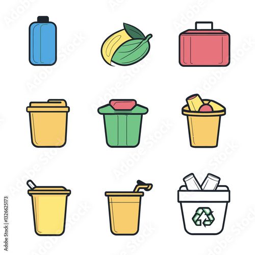 Vector Icons Set: Drinks, Recycling, Food, Trash, and Cases.