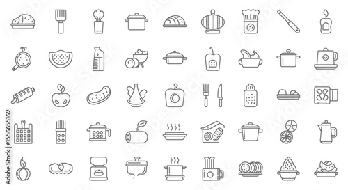 Vector Icons Set of Black and White Kitchen Utensils and Food Icons Set Line Art Style. Vector Illustrations. EPS Editable