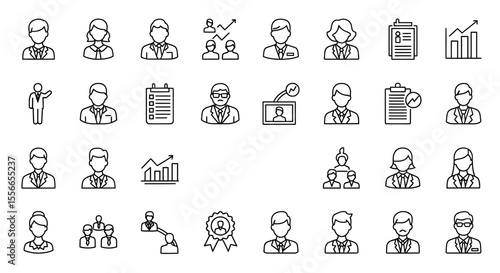 Vector Icons Set of Business People and Charts Outline Icons Set Professional Figures and Data Representation. Vector Illustrations. EPS Editable