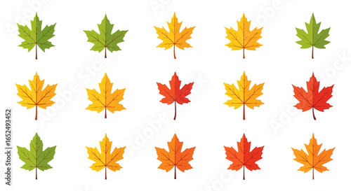 Vector Icons Set of Vibrant Array of Maple Leaves Illustrating the Seasonal Color Transition of Autumn. Vector Illustrations. EPS Editable