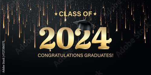 Vector illustration. Class of 2024 badge design template in black and gold colors. Congratulations graduates 2024 banner sticker card with academic hat for high school or college graduation