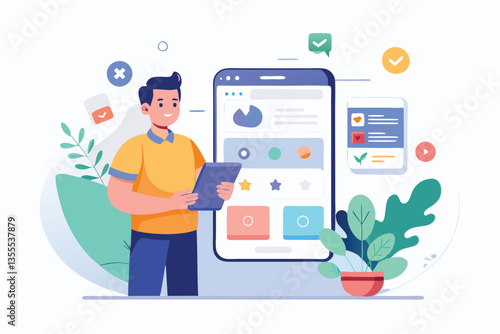 Vector illustration features a person engaged with a laptop while interacting with a user interface, showcasing technology and communication in a modern workspace