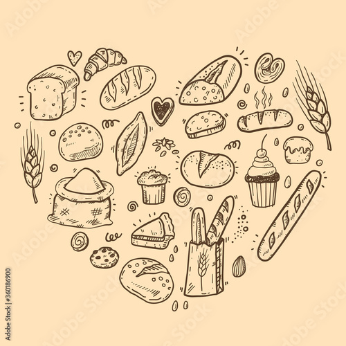 Vector illustration for bakery shops. Heart shape composition from hand drawn bread in sketch style. Fresh bread poster concept.